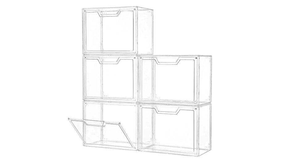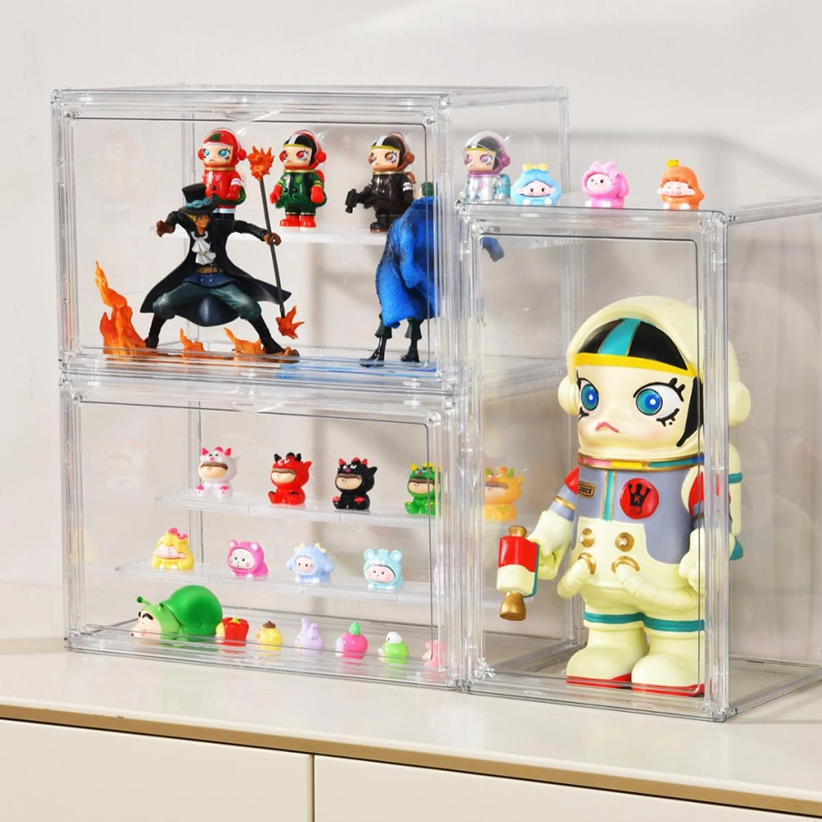 Showcase your collectibles safely with clear, stackable acrylic display cases featuring adjustable shelves and magnetic doors for easy access.